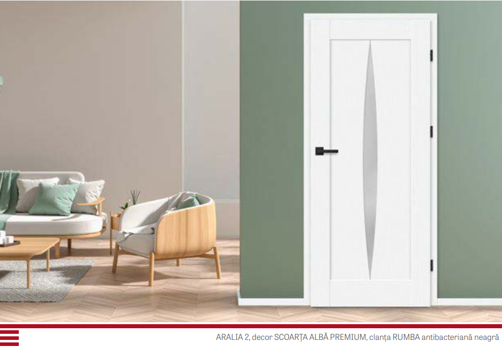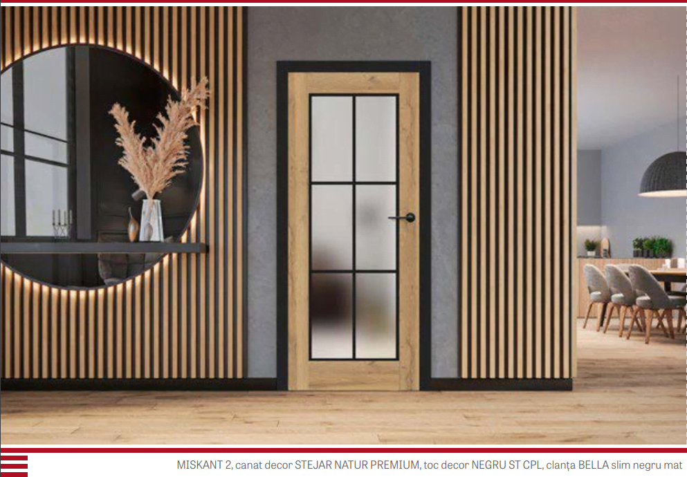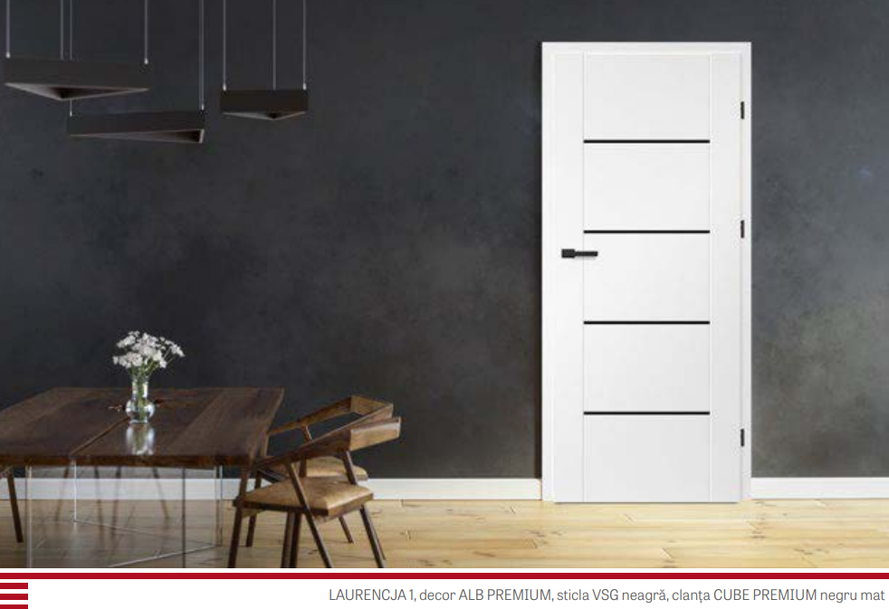 • rama în culoarea canaturilor si - optional - în decor ALB PREMIUM finisarea marginii canatului în culoare neagra, iar în cazul decorului LARICE LONGITUDINAL- finisarea marginii canatului în decor negru longitudinal